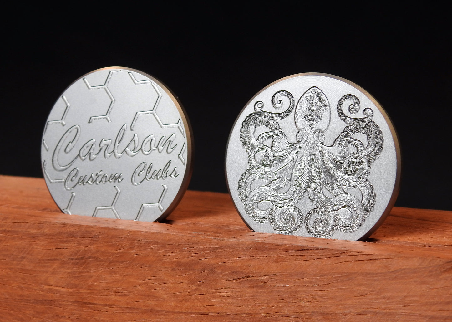 Looking for a less expensive personalized golf accessory? Jon will etch a stainless steel ball marker made to your custom artwork.
