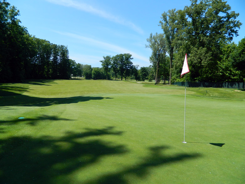 As you cross North Shore Avenue to the home hole, you’ll pass over the Paw Paw River on a winding wooden bridge similar to the tee islands on the 7th hole. Once again, the river is a continued hazard along the entire right side of this 420-yard par four.